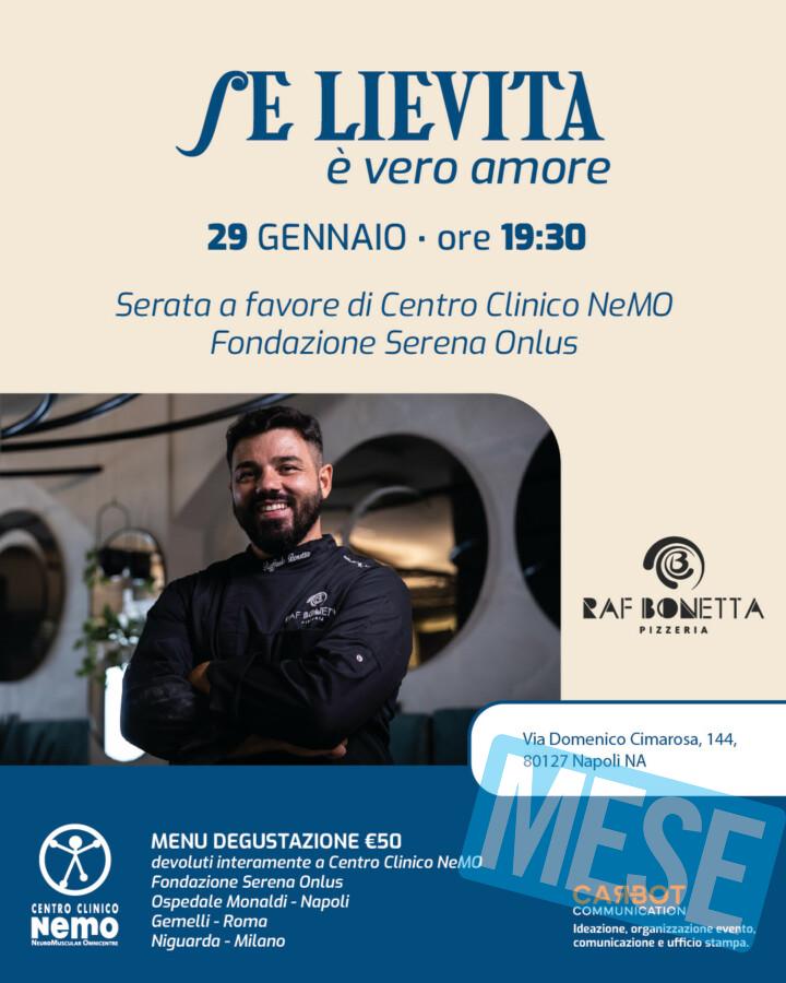 Entrambe le serate prevedono la possibilità di scegliere il menu degustazione solidale al costo di 50 euro con incasso interamente devoluto al Centro Clinico NeMO. Accanto alla degustazione, debuttano ufficialmente le Pizze NeMO “Lievitata d’Amore”, nate dall’estro, rispettivamente, di Manuel Maiorano e Raffaele Bonetta. Le pizze entreranno stabilmente nel menu delle pizzerie per un anno al costo di 9 euro. Ogni mese, l’incasso della Pizza NeMO sarà interamente devoluto in beneficenza.
