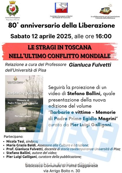 PONTE BUGGIANESE – Sabato 12 aprile p.v., alle ore 16,00, presso la Biblioteca Comunale di Ponte Buggianese in Via Boito 30, si terrà un convegno incentrato sulle “Stragi in Toscana nell’ultimo conflitto mondiale”, con una relazione del Prof. Gianluca Fulvetti, docente di storia contemporanea presso l’Università di Pisa.