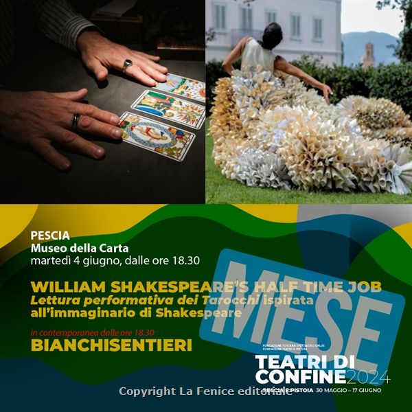 Martedì 4 giugno (dalle ore 18.30), al Museo della Carta di Pescia, è il momento di WILLIAM SHAKESPEARE’S HALF TIME JOB. Lettura performativa dei tarocchi ispirata all’immaginario di Shakespeare, di e con Marco Di Costanzo. William Shakespeare’s half time job, prodotto da Teatro dell’Elce con Fondazione Armunia Teatro Pasquini, è un’immersione nell’opera dell’autore inglese attraverso una forma scenica fedele ai testi e allo stesso tempo irriconoscibile, contemporanea. Lo sguardo dell’autore è impiegato in una lettura dei tarocchi per un singolo spettatore, veicolata con un linguaggio apparentemente “spontaneo”, estemporaneo, ma in realtà nutrito di frasi, immagini e aneddoti tratti dai suoi testi. Per assistere alla performance, per massimo 20 spettatori, è obbligatoria la prenotazione (una persona ogni 15 minuti, per le prenotazioni: 0573 991609 – 27112).