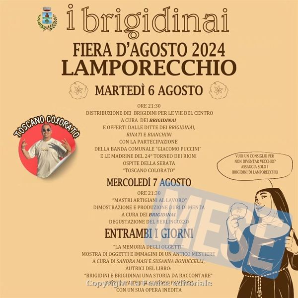 LAMPORECCHIO – Puntuale come poche sagre lo sanno essere, torna la Fiera annuale e Sagra del Brigidino di Lamporecchio che ha il suo clou da stasera, lunedi 5 a mercoledì 7 agosto 2024. Durante la fiera, potrete trovare bancarelle, il luna park e intrattenimento per grandi e piccoli. L’indiscusso protagonista sarà ancora una volta il brigidino, dolce tipico di Lamporecchio che vedrà il suo apice domani, martedi 6 agosto, dedicato alla sua esaltazione con distribuzione gratuita dalle ore 21,30 del dolce tipico a cura, ovviamente, dei brigidinai e grazie alla generosità delle due industrie locali, Rinati e Bianchini, mentre stasera, lunedi 5 agosto ci sarà l’ormai tradizionale concerto della Banda Musicale Puccini di Lamporecchio e mercoledì, in occasione dell’altrettanto tradizionale “fierino” si concluderà questa edizione con i fuochi artificiali che in paese molti sperano possano essere messi in concorrenza con quelli dell’estate di Vinci, conclusasi la settimana scorsa, appunto, con un spettacolo pirotecnico particolarmente gradito dalle migliaia di turisti e cittadini. La novità di quest’anno è la mostra di oggetti e immagini dell’antico mestiere dei brigidinai a cura di Sandra Masi e Susanna Bonuccelli, autrici del libro “Brigidini e brigidinai: una storia da raccontare”.