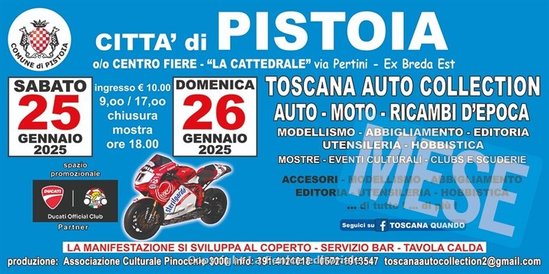 PISTOIA – Il Centro Fiere “La Cattedrale” di Pistoia ospita, sabato 25 e domenica 26 GENNAIO 2025, una nuova e interessante edizione di TOSCANA AUTO COLLECTION, la mostra di auto, moto, biciclette, ricambi e tutto cio’ che interessa gli appassionati e i collezionisti delle due e quattro ruote d’epoca.
