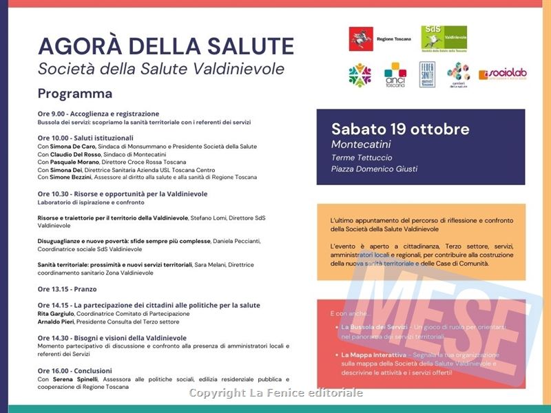 PISTOIA – Un intero sabato per discutere di sanità, sociale e territorio. L’Agorà della Salute della Società della Salute Valdinievole è l’iniziativa che si terrà sabato 19 ottobre 2024 dalle ore 9.00 alle ore 16.00, presso la splendida cornice delle Terme Tettuccio di Montecatini Terme, organizzata nell’ambito del progetto di Regione Toscana “Cantieri della Salute”, coordinato da Federsanità Anci Toscana con il supporto di Sociolab Impresa Sociale, e finalizzato a rafforzare il dialogo e la collaborazione comunitaria tra Istituzioni e Terzo settore. Amministratori regionali e locali, Società della Salute e Azienda Usl Toscana Centro, referenti dei servizi territoriali, Comitato di partecipazione, Consulta del Terzo settore, associazioni e cittadini si confronteranno sui temi legati, tra gli altri, alla riorganizzazione della sanità territoriale recata dal Decreto del Ministero della salute n.77 e dalla Delibera di Giunta regionale 1508/2022, che definiscono gli standard dei servizi e introducono alcune infrastrutture – come le Case di Comunità – su cui vengono