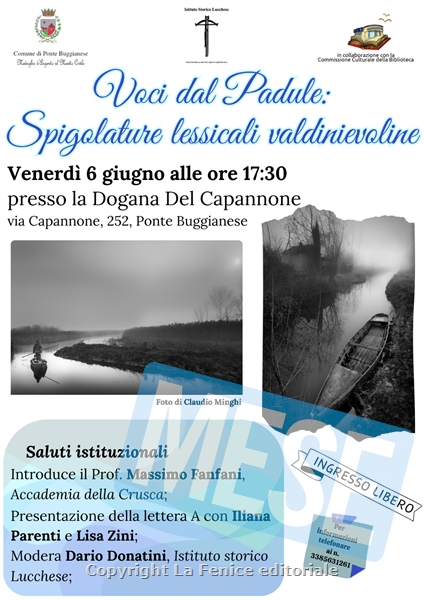 PONTE BUGGIANESE – L’Amministrazione Comunale di Ponte Buggianese, in collaborazione con la Commissione Cultura e l’Istituto Storico Lucchese Sezione Pescia-Montecarlo-Valdinievole organizza per venerdì 6 giugno 2025 alle ore 17,30 presso la Dogana del Capannone, nel salone del Centro di Documentazione del Padule di Fucecchio, un incontro sulle “Voci dal Padule: Spigolature lessicali valdinievoline”