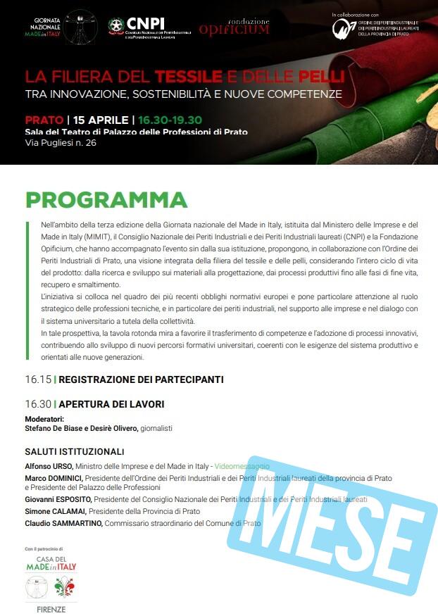 Prato – Nell’ambito della terza edizione della Giornata nazionale del Made in Italy, istituita dal Ministero delle Imprese e del Made in Italy, il territorio pratese ospiterà una iniziativa di caratura nazionale. Il Consiglio Nazionale dei Periti Industriali e dei Periti Industriali laureati (CNPI) e la Fondazione Opificium, che hanno accompagnato l’evento sin dalla sua istituzione, propongono infatti, in collaborazione con l’Ordine dei Periti Industriali di Prato, il convegno ‘La filiera del tessile e delle pelli, tra innovazione, sostenibilità e nuove competenze’.