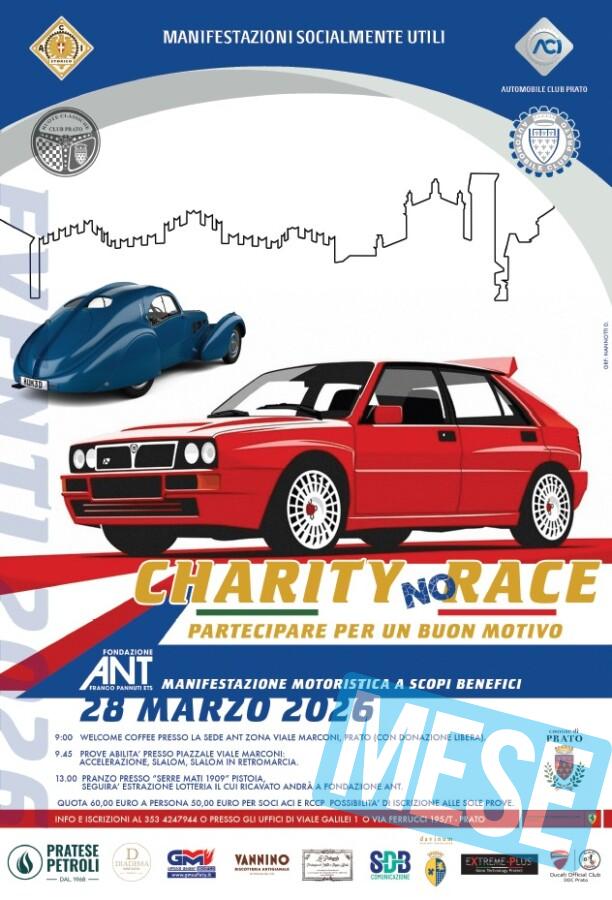 Prato – Appuntamento sabato 28 marzo con l’iniziativa ‘Charity no Race 2026’. Al mattino dalle 9.45 le prove motoristiche di abilità in viale Marconi nel piazzale ex Fiera. Poi il pranzo solidale alle Serre Mati 1909 a Pistoia. Il ricavato andrà in favore delle attività della Fondazione Ant Franco Pannuti Ets