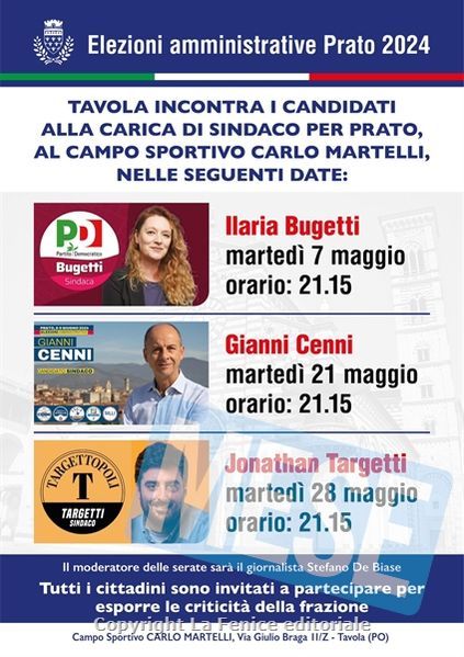L’ospite del primo incontro del 7 maggio sarà Ilaria Bugetti, candidata per la coalizione di centrosinistra. Due settimane dopo, il 21 maggio, sarà la volta di Gianni Cenni, candidato della coalizione di centrodestra. Il 28 maggio, infine, si terrà l’incontro pubblico con il candidato civico della lista Targettopoli, Jonathan Targetti.
