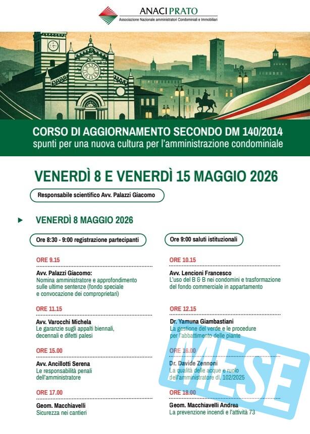 Prato – Due giornate di formazione e aggiornamento rivolte agli amministratori di condominio. E’ quanto organizza Anaci Prato, l’Associazione Nazionale Amministratori Condominiali e Immobiliari, per venerdì 8 e venerdì 15 maggio negli spazi dell’Art Hotel Museo di viale della Repubblica. Si tratta del corso di aggiornamento organizzato secondo il decreto ministeriale 140/2014, quello che sancisce i criteri e le modalità per la formazione degli amministratori di condominio nonché dei corsi di formazione per gli amministratori condominiali. La duplice iniziativa si pone l’obiettivo di portare “spunti per una nuova cultura per l’amministrazione condominiale”. Le due giornate di formazione sono aperte sia agli amministratori iscritti ad Anaci che a quelli non iscritti. Sono previsti inoltre crediti formativi per gli iscritti al Collegio dei Geometri di Prato.