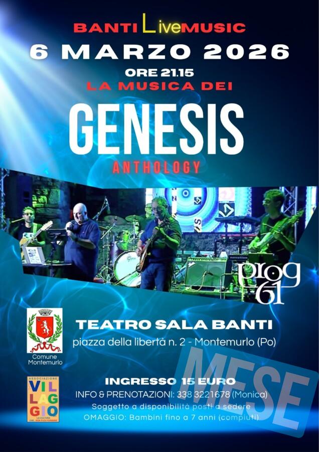 Montemurlo – Una serata dedicata all’anthology dei Genesis. Inizia così, venerdì 6 marzo, la rassegna musicale e culturale ‘Banti Live Music’, promossa dall’Associazione Il Villaggio Aps in collaborazione con il Comune di Montemurlo. L’appuntamento è alle 21.15 in Sala Banti a Montemurlo, piazza della Libertà. A omaggiare una delle band più influenti della storia del rock progressivo saranno i PROG61, gruppo di musicisti esperti e appassionati proprio dei Genesis.