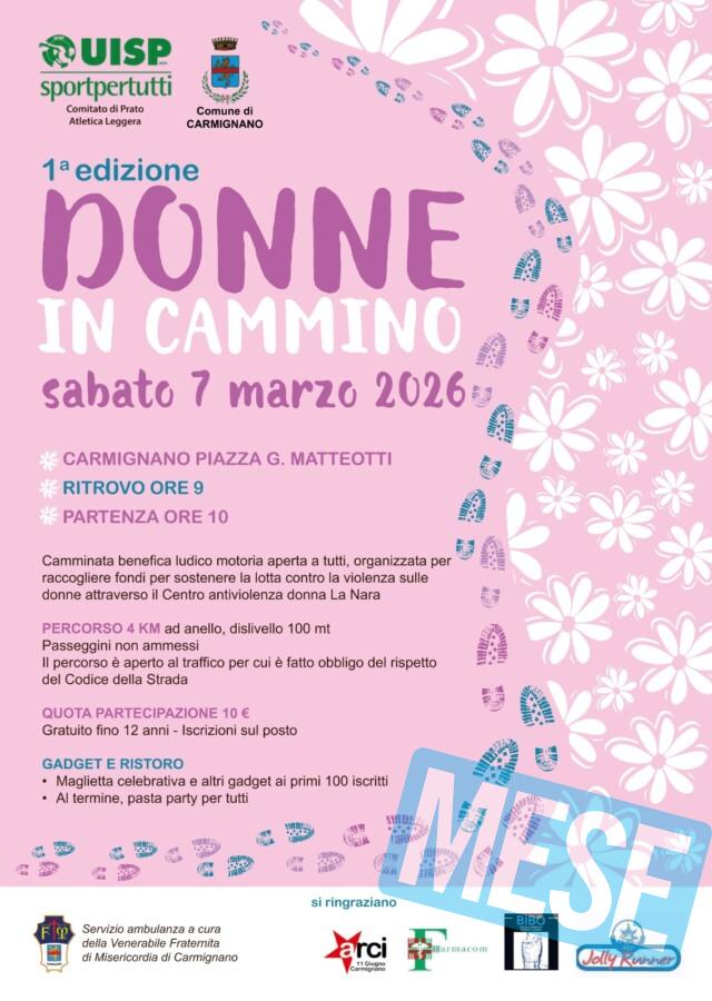 Prato-Carmignano – Non una semplice passeggiata in rosa, ma un cammino lungo 4 chilometri per condividere il progetto di sostenere le donne vittime di violenza. Si terrà sabato 7 marzo la prima edizione di ‘Donne in Cammino’, l’iniziativa benefica ludico motoria organizzata per raccogliere fondi per sostenere la lotta contro la violenza sulle donne attraverso il Centro antiviolenza La Nara. A organizzare la camminata Uisp Prato e il Comune di Carmignano. L’invito alla partecipazione è rivolto a tutta la comunità. Il ritrovo è alle 9 in piazza Matteotti a Carmignano. Un’ora più tardi la partenza dell’iniziativa. Il percorso è anello, con un dislivello di 100 metri. I passeggini non sono ammessi, anche perché il tracciato è aperto al traffico, per cui è fatto obbligo del rispetto del Codice della Strada. Da piazza Matteotti si va verso via Tempesti, via Ser Lapo Mazzei, via Redi, via Borchi, via Loggette, via Pucci e Verdini, largo della Repubblica, via Roma, via Modesti, via Chiti, via di Castello, via Ertone, piazza S. Cristina, via Vergheretana, via del Camposanto, via Marcignano, via Vergheretana, via Nencioni, Belvedere padre Bocci, viale Parenti, via Modesti, parcheggio S. Caterina, via Pontormo, piazza Niccolini, via Roma e arrivo al circolo 11 Giugno per il pasta party. La quota di partecipazione è di 10 euro, con iscrizioni sul posto. L’iniziativa è gratis per i minori di 12 anni. Per l’evento si ringraziano: Misericordia di Carmignano per il servizio ambulanza, circolo Arci 11 Giugno, Farmacom, Jolly Runner e Bibo Acque Minerali.