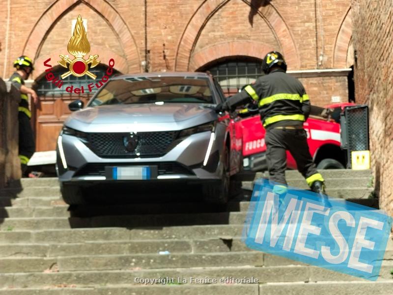 SIENA – I Vigili del fuoco del comando di Siena, sede centrale, sono intervenuti alle ore 14:10 nel comune di Siena in Via S. Martino e Vicolo dell’oro, per soccorrere il conducente della vettura che è finita sulla scalinata. Sul posto è stata inviata una squadra che ha provveduto a mettere in sicurezza la vettura attraverso una fascia collegata al mezzo dei Vigili del fuoco per evitare un ulteriore scivolamento e ha consentito al conducente di scendere dal veicolo che stava mantenendo azionato il pedale del freno. Altre due persone che si trovavano a bordo sono uscite in autonomia.