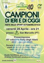 La AS ABETI RACING ha il piacere di annunciare che questo traguardo significativo, raggiunto grazie alla passione ed al grande lavoro partito nel 1983 da parte di tutti i membri del sodalizio, impegno che ha portato il “rally più verde d’Italia” ad essere anche l’ideale veicolo di comunicazione del territorio della Montagna Pistoiese, verrà presentato venerdì 28 aprile alle ore 21,00 all’auditorium di Dynamo Camp, a Limestre (Pistoia).