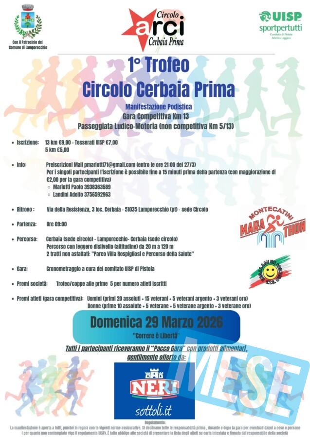 Lamporecchio – Domenica 29 marzo il località Cerbaia di Lamporecchio si corre la prima edizione del ‘’Trofeo Circolo Cerbaia”. Prima, gara podistica competitiva di km 13 e ludico motoria di km 5 e 13 , organizzata dalla Montecatini Marathon con la collaborazione del Circolo Tamburini e la collaborazione tecnica della Lega Provinciale di Atletica Leggera della Uisp. La manifestazione avrà anche il patrocinio dell’Amministrazione Comunale di Lamporecchio.