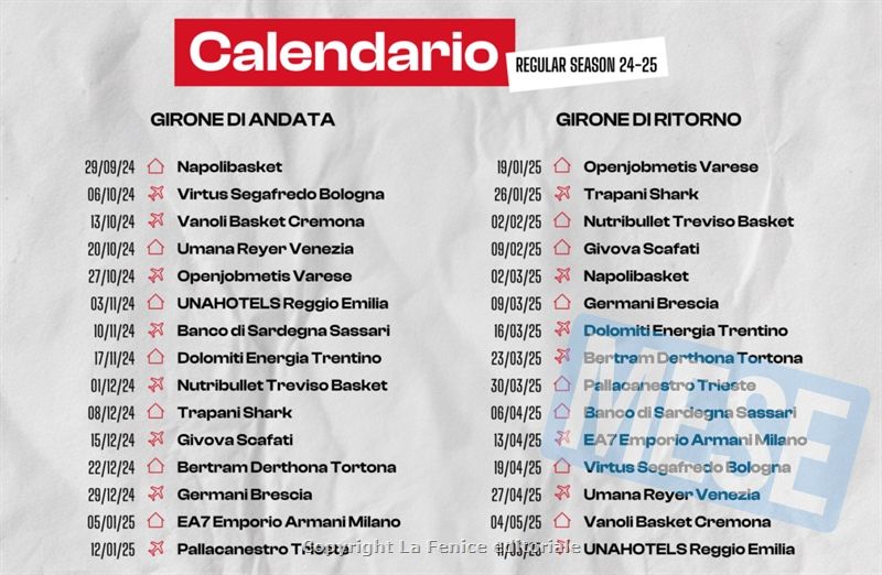Per quanto riguarda le pause, un primo stop ci sarà a novembre per la prima “finestra” dedicata alle Nazionali e la seconda sarà a febbraio dove ci si fermerà ancora per le qualificazioni degli azzurri a EuroBasket 2025 e la Final Eight di Coppa Italia in programma, anche nel 2025, alla Inalpi Arena di Torino. L’ultima partita casalinga della regular season sarà domenica 4 maggio contro la Vanoli Cremona mentre la 30° giornata vedrà i biancorossi impegnati in trasferta al “PalaBigi” contro Reggio Emilia.