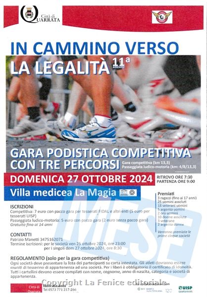 QUARRATA – Nel bellissimo scenario della Villa Medicea La Magia di Quarrata (Pistoia) si svolgerà domenica 27 ottobre una gara podistica competitiva denominata ‘’ In Cammino Verso la Legalità’’ di km 13,300 per i competitivi e di km 4-8-13,300 per i partecipanti alla ludico motoria, e categorie giovanili (fino a 14 anni) su varie distanze, organizzata dalla Podistica Quarrata con il patrocinio dell’ Amministrazione Comunale