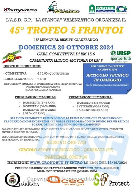 QUARRATA – Grande attesa a Valenzatico per domenica 20 ottobre, frazione del comune di Quarrata in provincia di Pistoia per l’edizione numero 45 del ‘’Trofeo 5 Frantoi’’ gara podistica competitiva di km 15,600 e ludico motoria di km 8, organizzata dal Gruppo Podistico La Stanca con il patrocinio del comune di Quarrata .