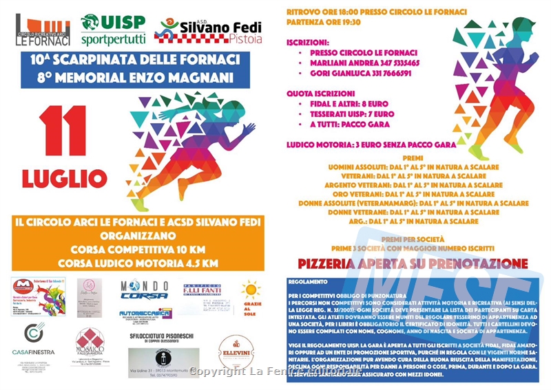 PISTOIA – Il Circolo Arci Le Fornaci di Pistoia in collaborazione con la società Silvano Fedi, organizza per venerdì 11 Luglio una gara podistica competitiva di km 10 per i competitivi e di km 4,500 per i partecipanti alla ludico motoria e denominata ‘’ 10^ Scarpinata delle Fornaci-5° Memorial Enzo Magnani’’.