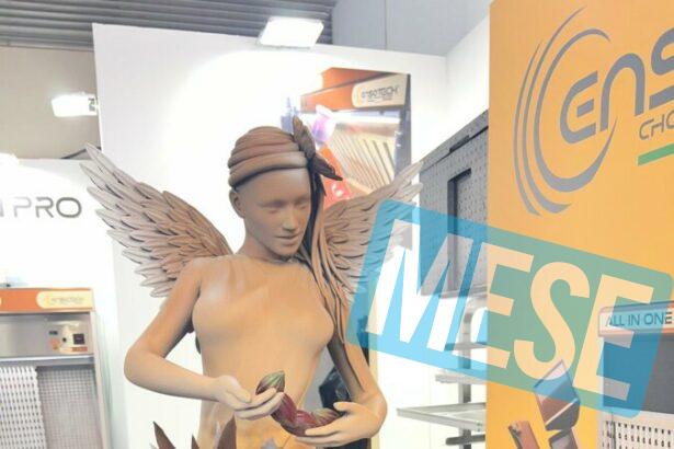 Prato - Una statua di cioccolato fondente alta 1 metro e venti centimetri raffigurante una donna alata, con un fiore…